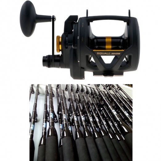 We recommend you spool your Penn Squall SQL30VSW 2-Speed Lever Drag Reel / Sloopster F5 Standup Rod Combo with hollowcore and a mono topshot, but if you are sticking to a budget, straight mono is a great option. Reels are black with gold accents. Rods are 5’6″, 50-100 lb class and black.