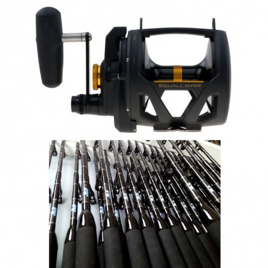 We recommend you spool your Penn Squall SQL50VSW 2-Speed Lever Drag Reel / Sloopster F5 Standup Rod Combo with hollowcore and a mono topshot, but if you are sticking to a budget, straight mono is a great option. Reels are black with gold accents. Rods are 5’6″, 50-100 lb class and black.