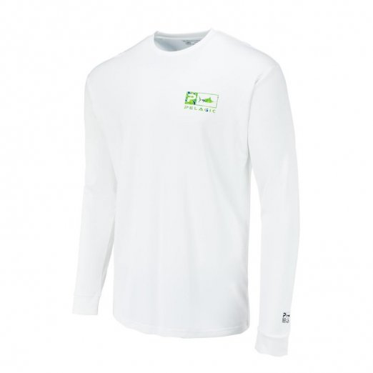 Pelagic Aquatek Icon Long Sleeve Performance Shirts are available in M-2XL. The shirt is white with Green Dorado artwork. Looks and performs great! Get one for yourself and for that friend who loves dorado!